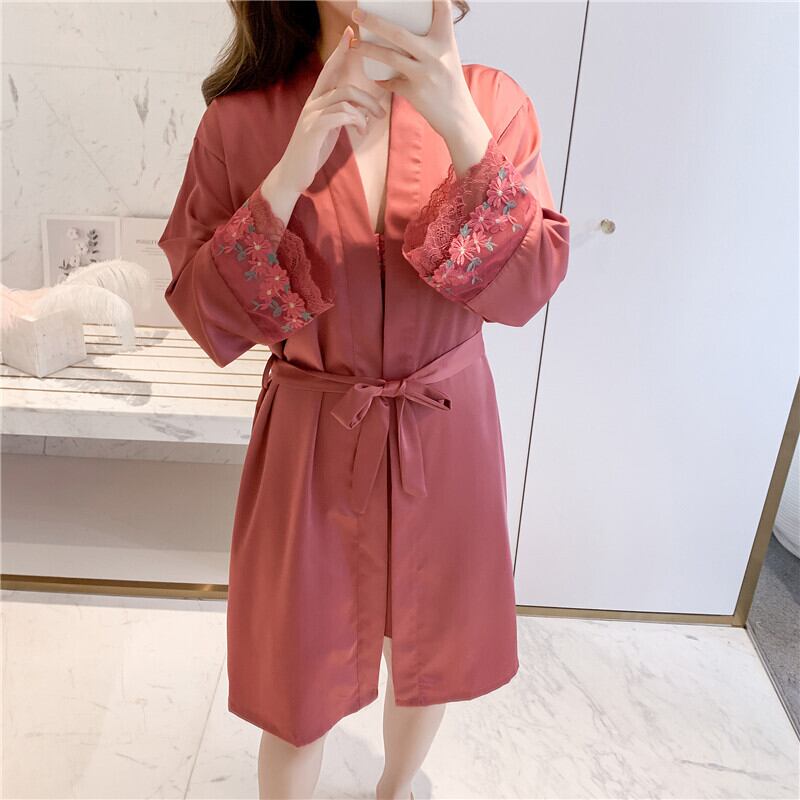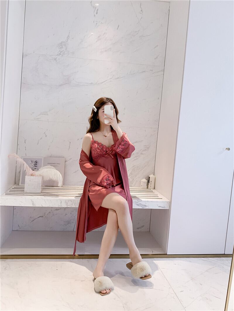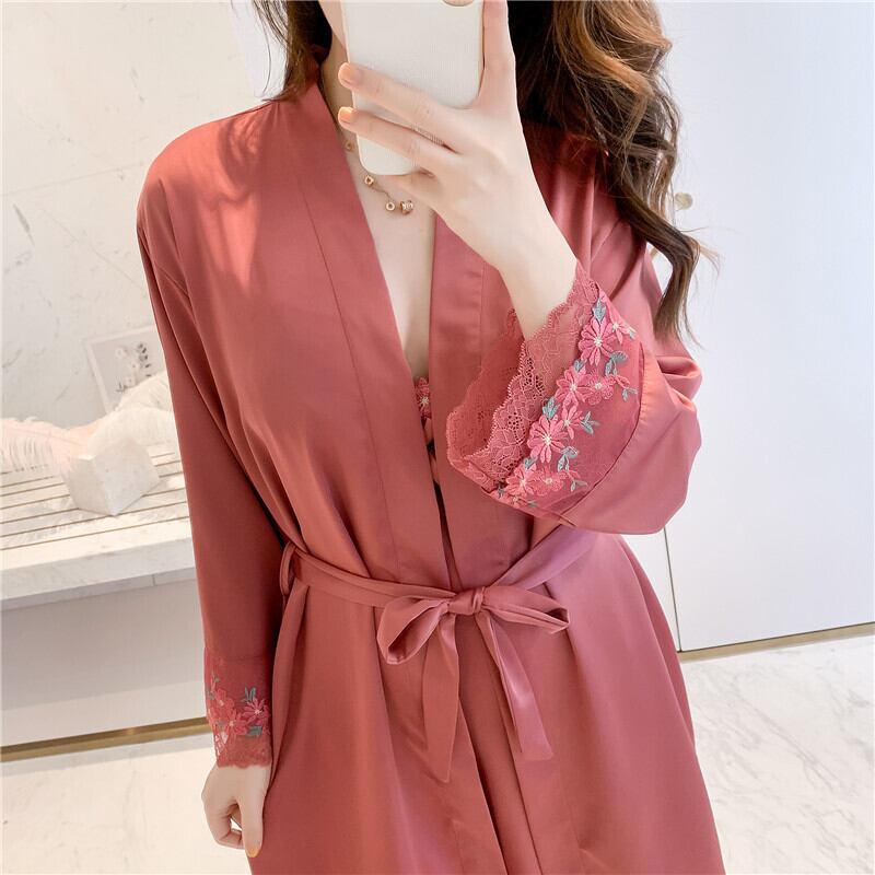 女性の春と夏のセクシーなサスペンダー刺繍レースナイトドレスツーピーススーツアイスシルク長袖ナイトガウン胸パッド付きパジャマを集めました ロング レッド スプリング 春物 夏物 ワンピース ランジェリー セクシー ルームウェア45225159407 | Plug Shop
