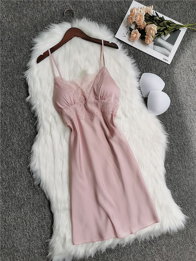 胸パッドスリング女性アイスシルクサマーレースサイドホルターナイトドレスVネック春と秋の家でセクシーなギャザーパジャマ レッド スプリング 春物 夏物 オータム 秋物 ワンピース ランジェリー セクシー ルームウェア27159513218 | Plug Shop