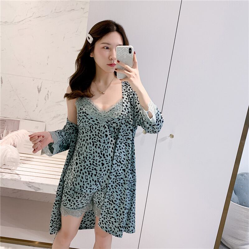 セクシーなパジャマ女性の夏のシミュレーションシルクネグリジェホームサービス薄い春と秋のレースヒョウ柄の胸パッド付きスリーピーススーツ スプリング 春物 夏物 オータム 秋物 ランジェリー セクシー ルームウェア74486719739 | Plug Shop