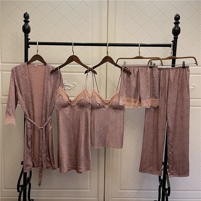 春秋パジャマレディースヒョウ柄スタイルホームサービス胸パッド5ピースセクシーアイスシルク長袖パンツスーツ ロング スプリング 春物 オータム 秋物 ランジェリー セクシー ルームウェア93228375667 | Plug Shop