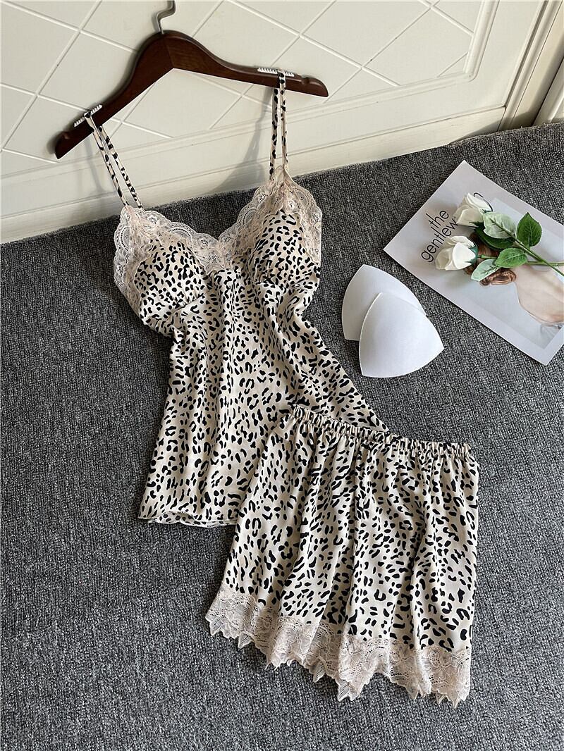ヒョウ柄のレースパジャマ、胸囲スリング、胸パッド、アイスシルクショーツ、ツーピーススーツ、ホームサービス、アウター レッド ランジェリー セクシー ルームウェア71862302265 | Plug Shop