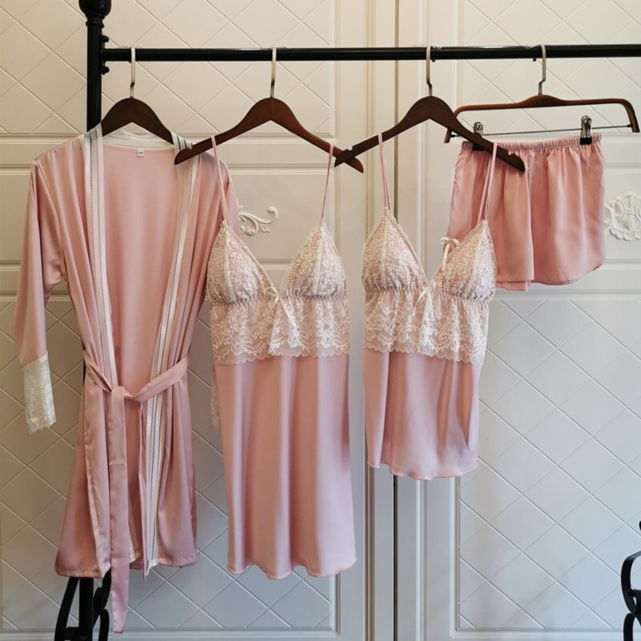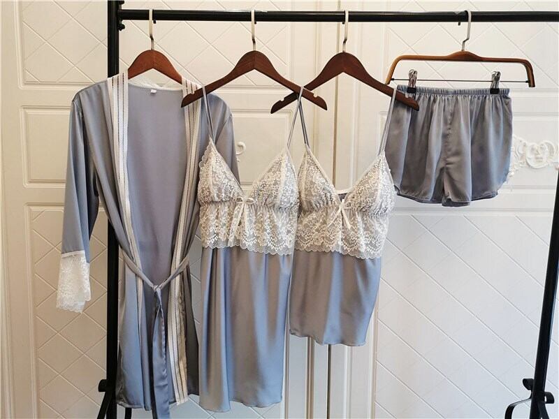 insパジャマ女性秋長袖ネグリジェセクシーレーススリング胸パッドシルク4ピーススーツは家庭服の外で着用することができます ロング オータム 秋物 NEW ランジェリー セクシー ルームウェア97045707607 | Plug Shop