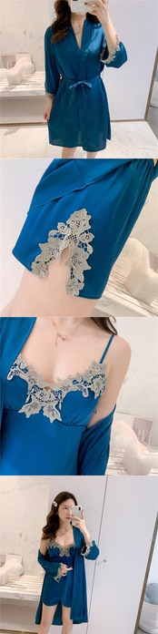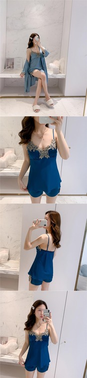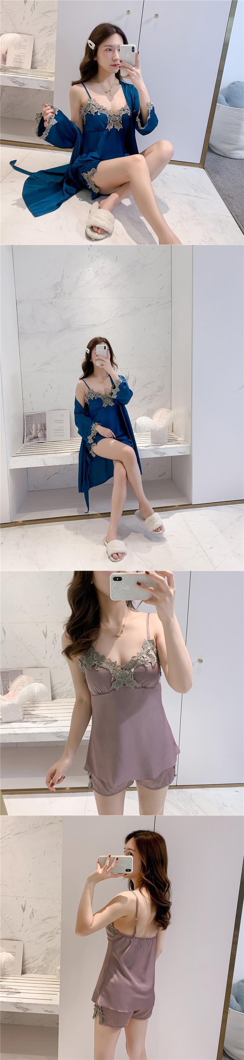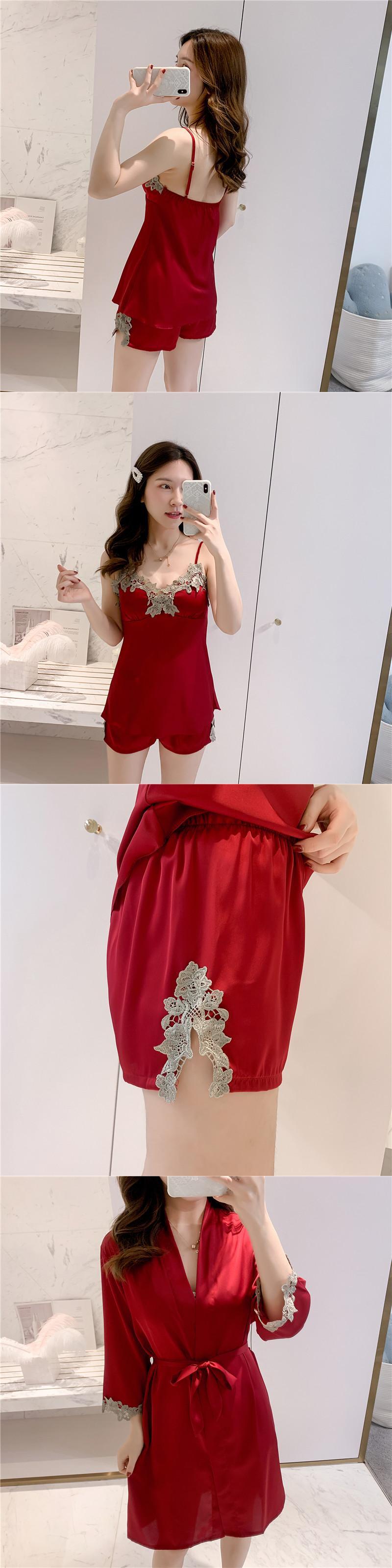 シルクパジャマ女性XiaZhenシルクセクシー刺繍サスペンダーショーツ長袖スリーピースホームサービス、薄い胸パッド付き ロング レッド ランジェリー セクシー ルームウェア86196634686 | Plug Shop