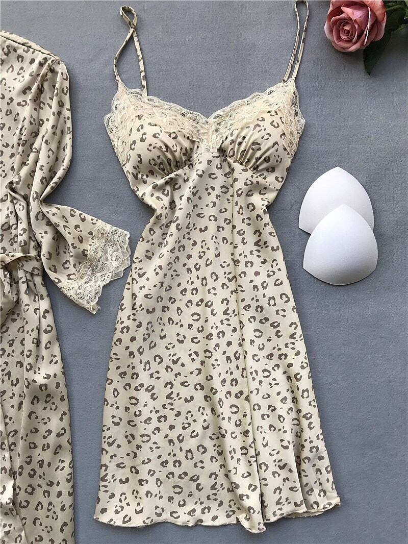 セクシーなヒョウのスーツの女性の春と秋のアイスシルクスリングチェストパッドナイトドレスナイトガウンツーピースパジャマホームサービス薄片 スプリング 春物 オータム 秋物 ワンピース ランジェリー セクシー ルームウェア96212417113 | Plug Shop