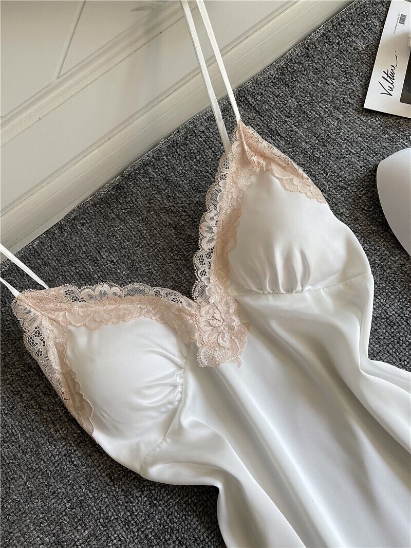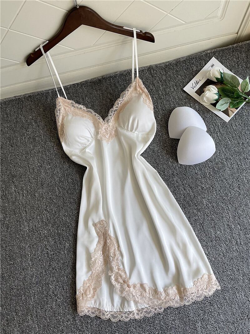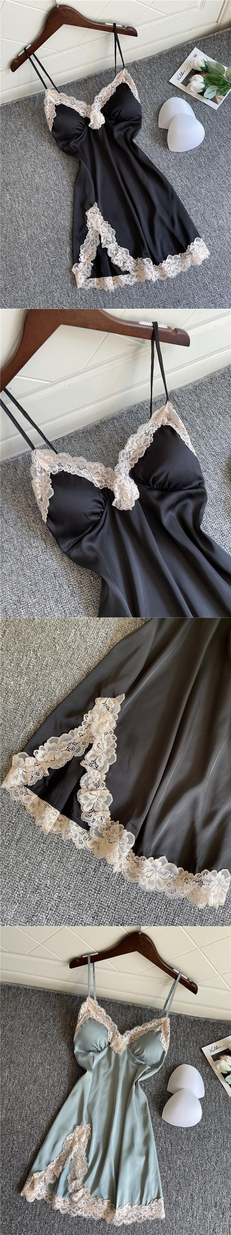 アイスシルクパジャマ女性夏セクシーサイドスリットスリングネグリジェ胸パッドギャザーレースディープVネック誘惑ショートスカート レッド 夏物 ワンピース ランジェリー セクシー ルームウェア59024066494 | Plug Shop