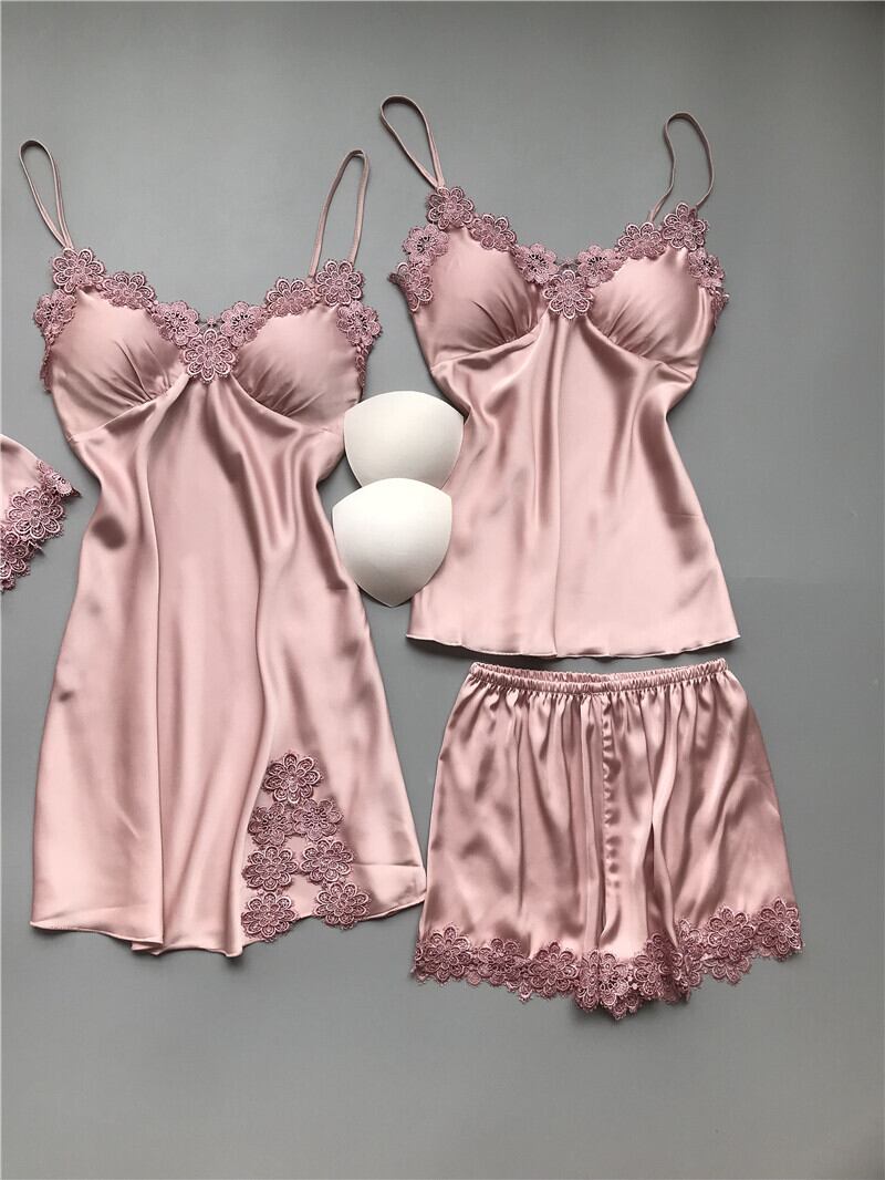 韓国版アイスシルクパジャマ女性の春と秋のセクシーなスリングチェストパッド長袖ナイトガウンホームサービス薄い秋と冬の4ピーススーツ ロング スプリング 春物 オータム 秋物 ウィンター 冬物 韓国ファッション スタイル ランジェリー セクシー ルームウェア17727949987 | Plug Shop