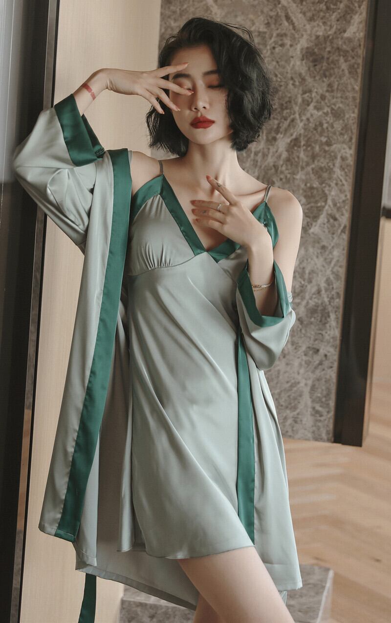ナイトドレス女性夏春秋アイスシルクスリング胸パッド長袖ネグリジェホームサービスツーピース小さなセクシーなパジャマ ロング スプリング 春物 夏物 オータム 秋物 ワンピース ランジェリー セクシー ルームウェア11713286520 | Plug Shop