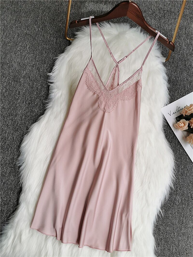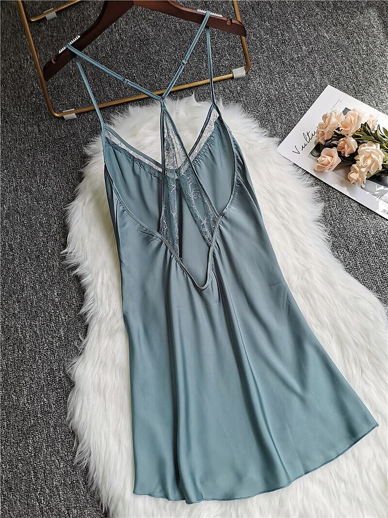 スタイルパジャマ女性の夏のシルクサスペンダーパジャマナイトドレスレースセクシーな大きな背中の開いた美しいバックサスペンダードレス 夏物 ワンピース ランジェリー セクシー ルームウェア83414721855 | Plug Shop