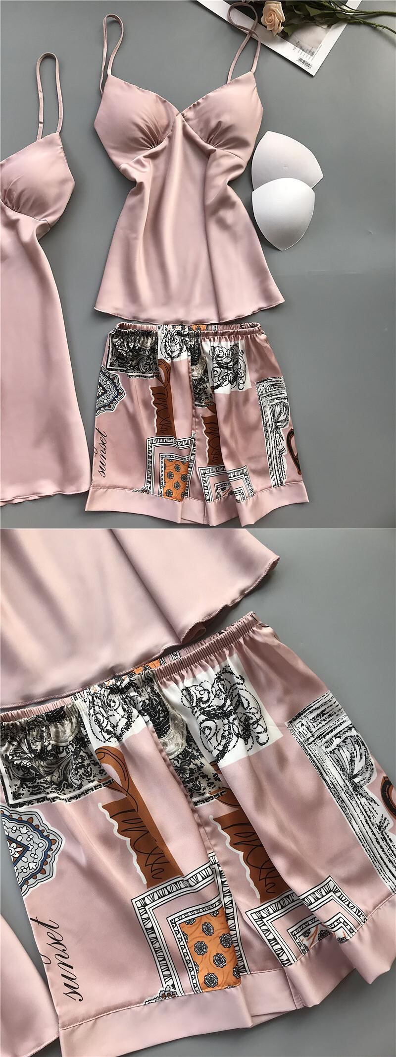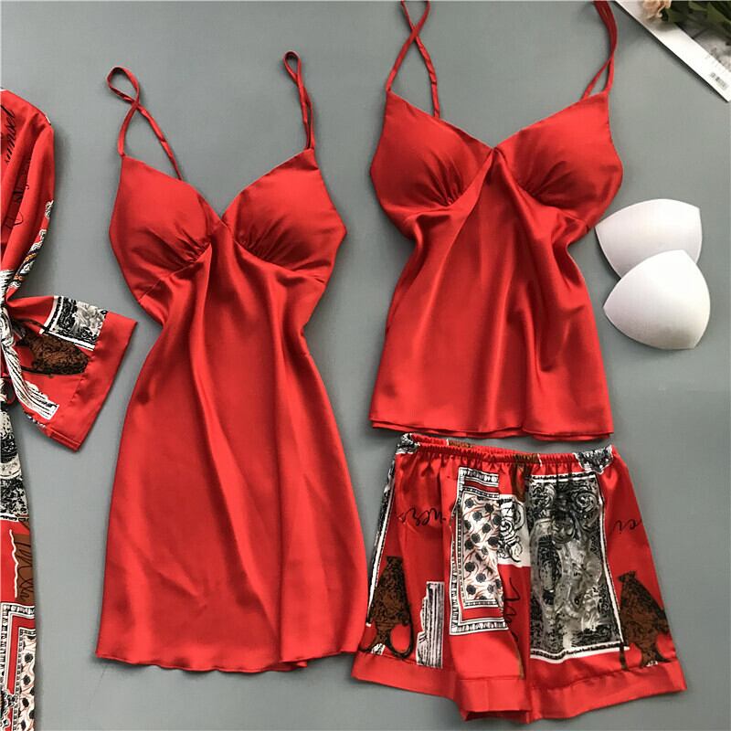 アイスシルクパジャマ女性春と秋のパジャマ胸パッドイン小さな胸ストラップシルクパジャマ4ピースホームサービス長袖 ロング スプリング 春物 オータム 秋物 NEW ランジェリー セクシー ルームウェア72765368987 | Plug Shop