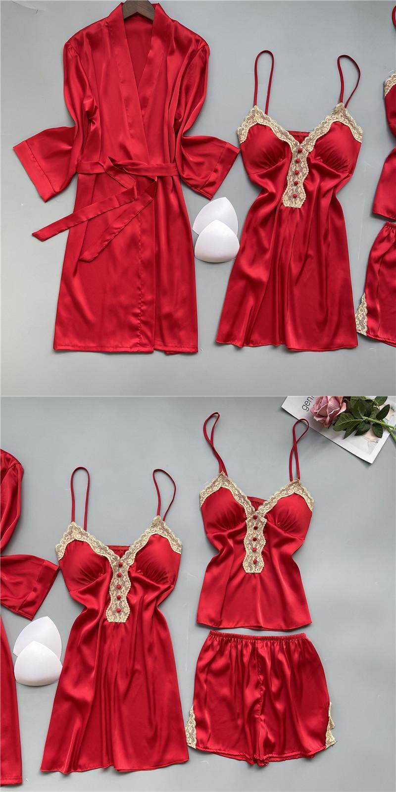 春、夏、秋の赤いパジャマ女性のアイスシルクネグリジェセクシーなレースVネックスリングチェストパッドバスローブ3または4セット レッド スプリング 春物 夏物 オータム 秋物 ランジェリー セクシー ルームウェア34999961991 | Plug Shop