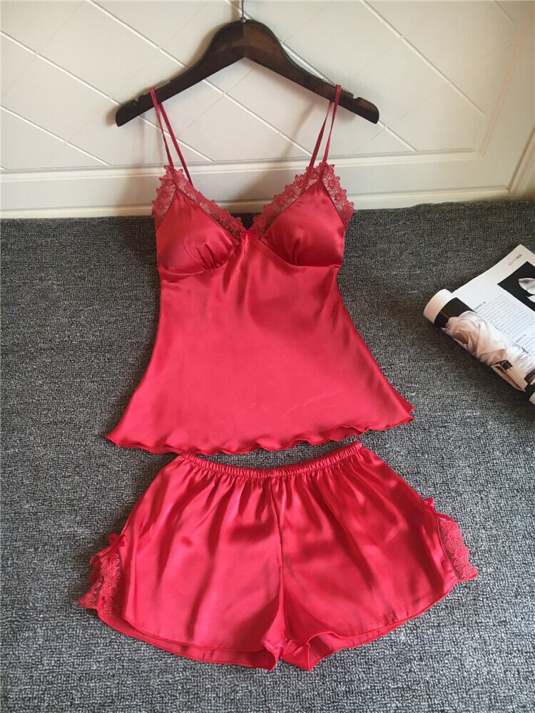胸パッドギャザーサスペンダーショーツツーピースシルクブラックラージサイズホームサービススーツでセクシーなパジャマ女性の夏 レッド 大きめサイズ 夏物 ランジェリー セクシー ルームウェア78247533391 | Plug Shop