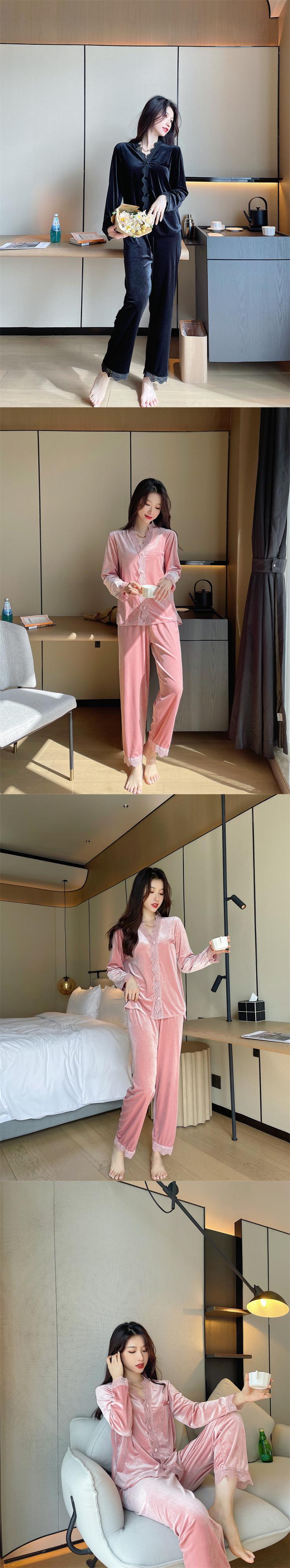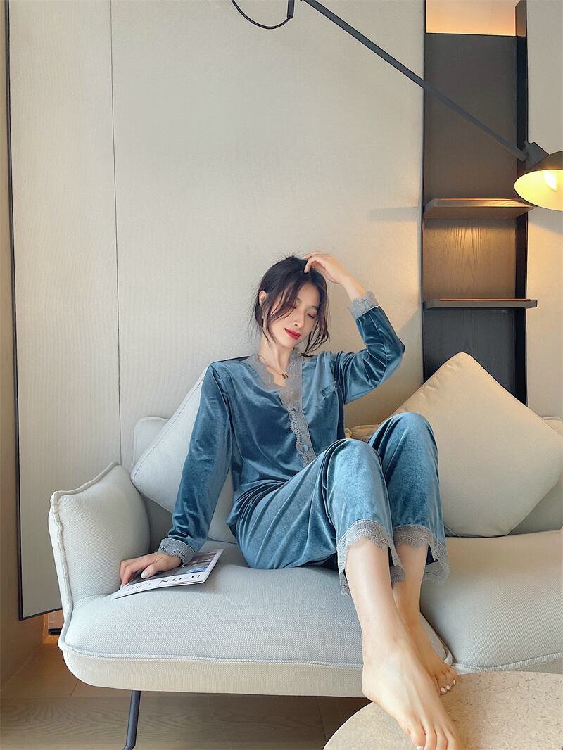 秋冬ゴールドベルベットパジャマレディーススーツ長袖カジュアルウェーブレース無地韓国カジュアルホームウェア ロング オータム 秋物 ウィンター 冬物 ソリッドカラー 韓国ファッション ランジェリー セクシー ルームウェア41908439657