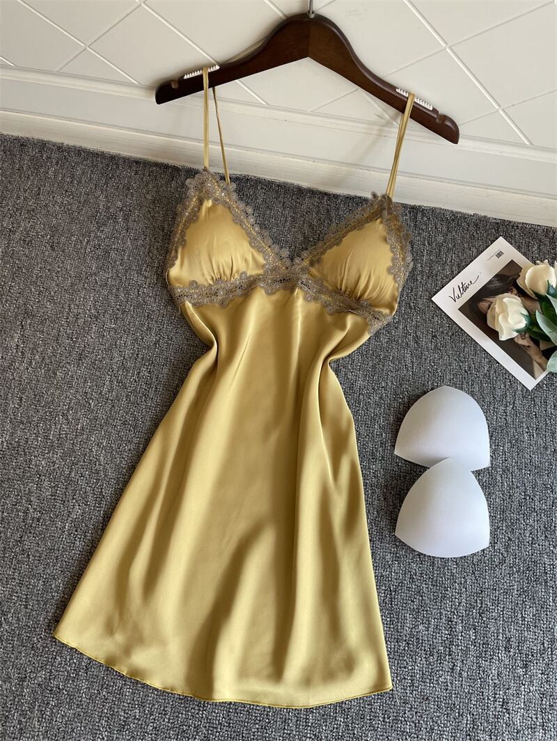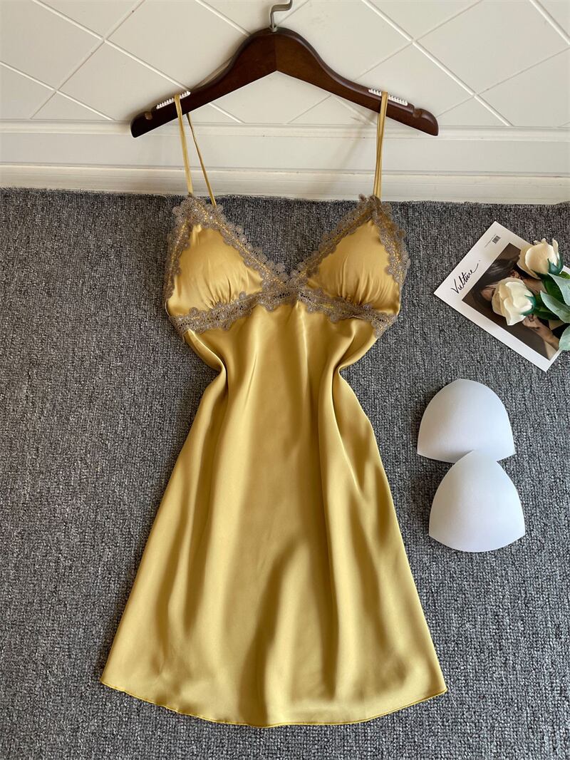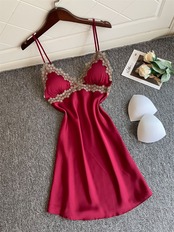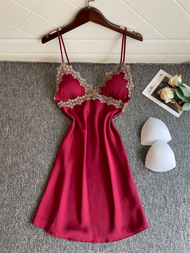 胸パッド付きのセクシーなパジャマ女性の夏のアイスシルク薄片セクシーな小さな胸が集まったレースのサスペンダーネグリジェの誘惑 レッド 夏物 ワンピース ランジェリー セクシー ルームウェア78231797955 | Plug Shop