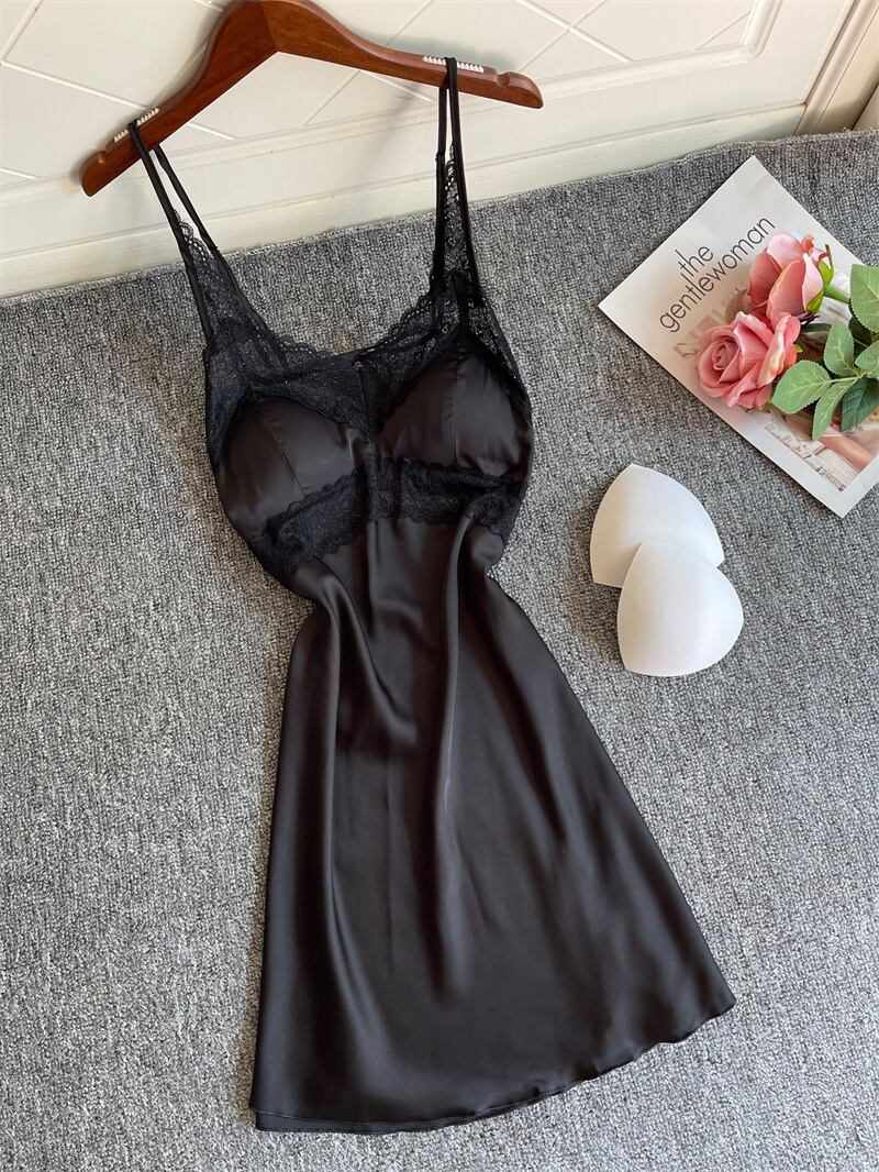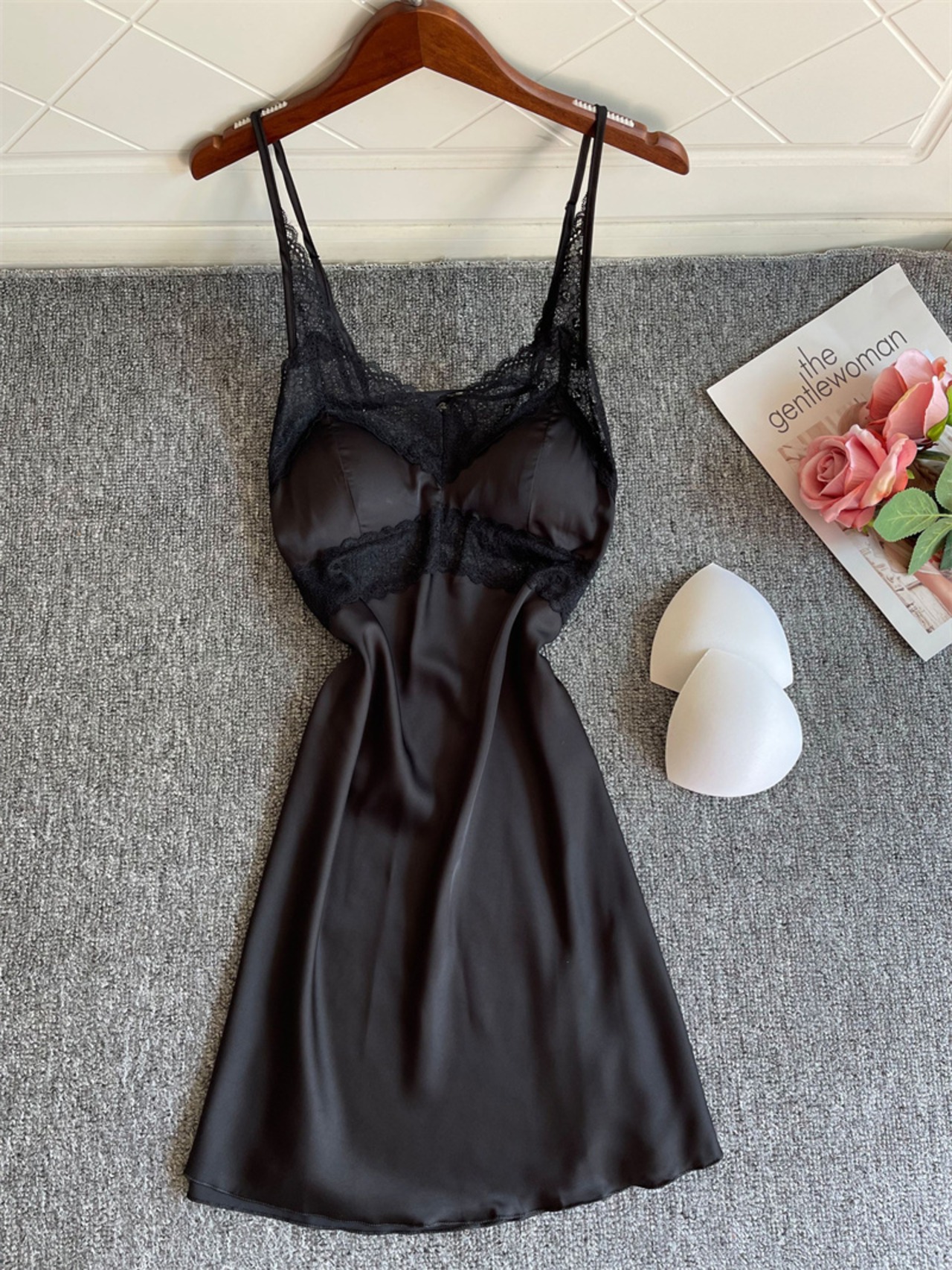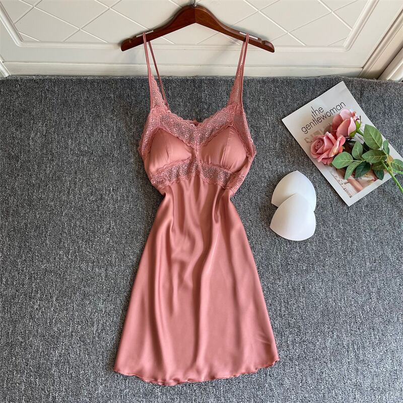 セクシーなパジャマ女性の2022年夏の新しいアイスシルクサスペンダーナイトドレス薄いVネックレースチェストパッド付きホームサービス 夏物 ワンピース ランジェリー セクシー ルームウェア76498973983 | Plug Shop