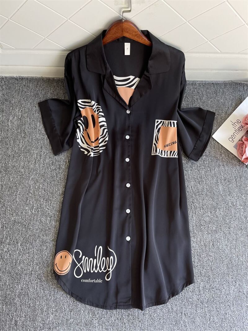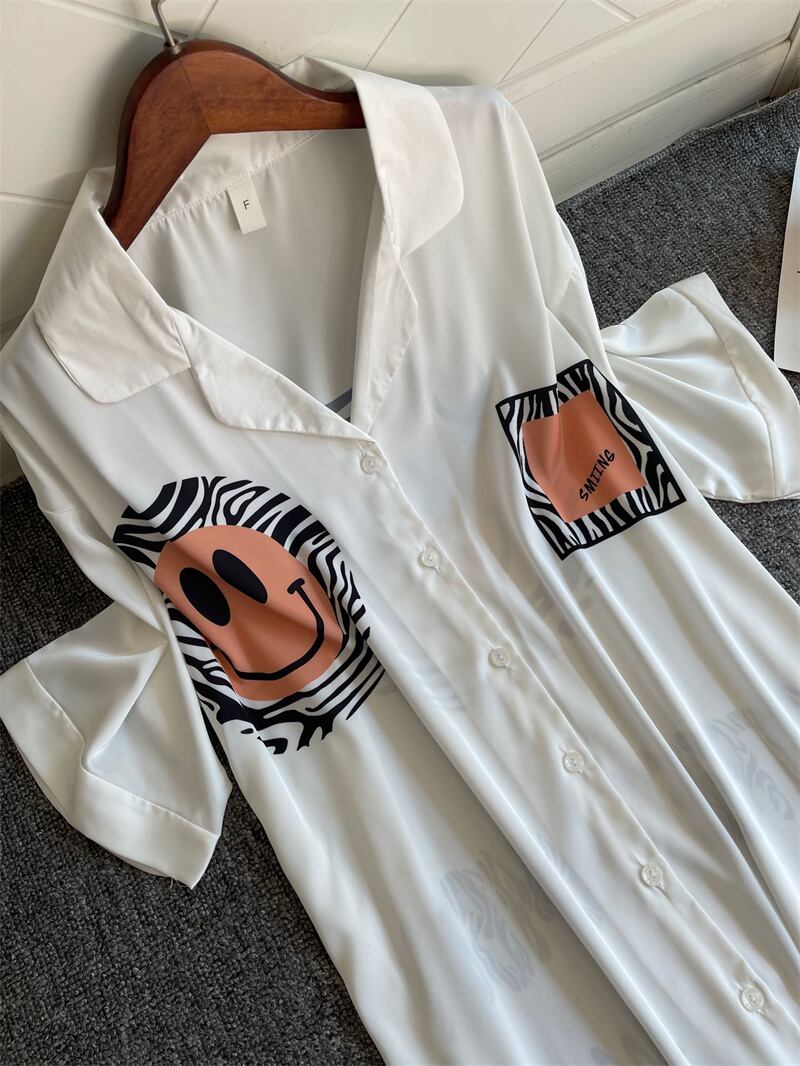 カジュアルアイスシルクシャツパジャマ若い女性春と夏の薄いネグリジェ漫画アニメスマイリーフェイスアイスシルクプリント スプリング 春物 夏物 ワンピース ランジェリー セクシー ルームウェア11720895417 | Plug Shop