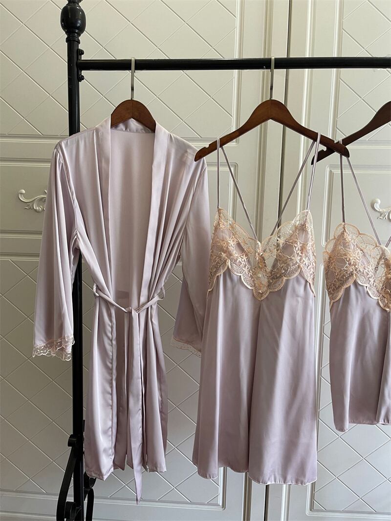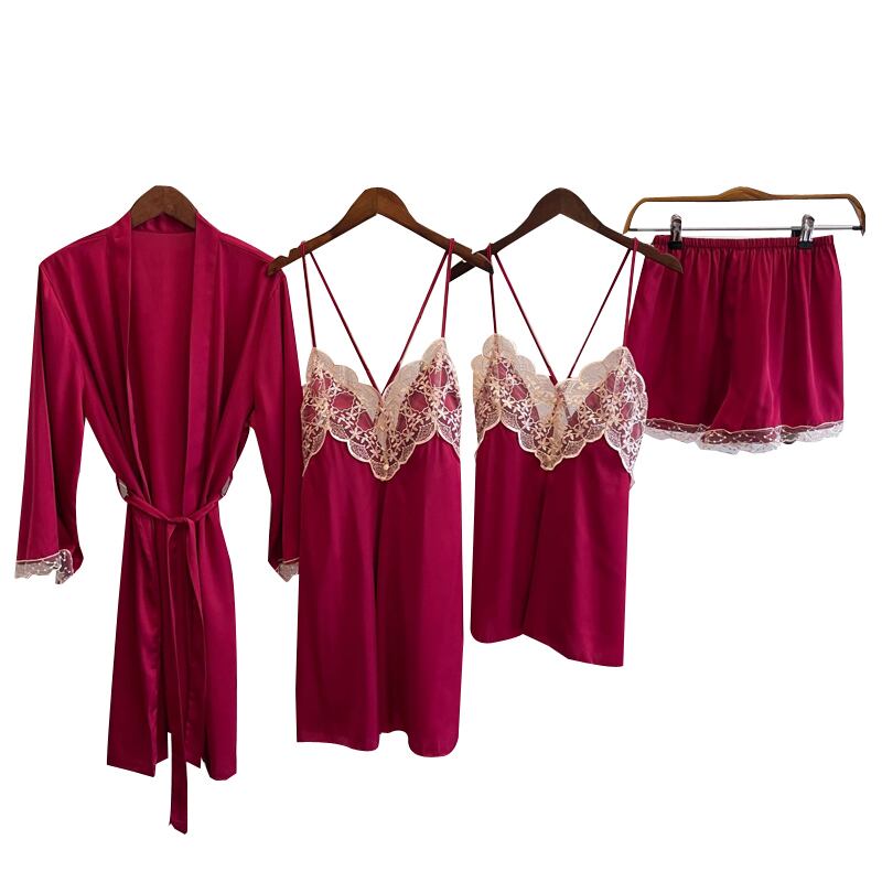 胸パッド付きパジャマ女性の夏のセクシーなボタンシルク4ピースセット薄いカジュアルサスペンダーショーツ長袖ネグリジェホーム ロング 夏物 ランジェリー セクシー ルームウェア78866810995 | Plug Shop