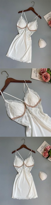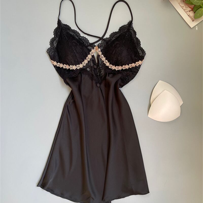 夏の新しいカジュアルなVネックアイスシルクサスペンダー薄い家庭服美しいバッククロスパジャマ女性の胸パッド付きショートスカート 夏物 ランジェリー セクシー ルームウェア16668472259 | Plug Shop
