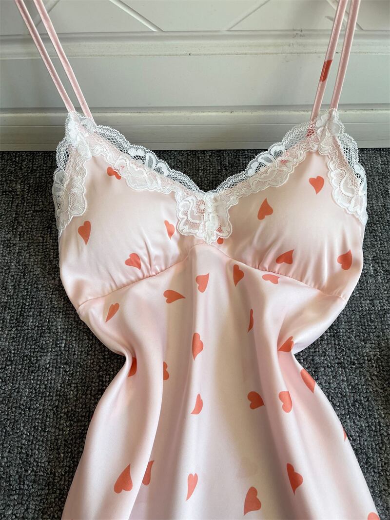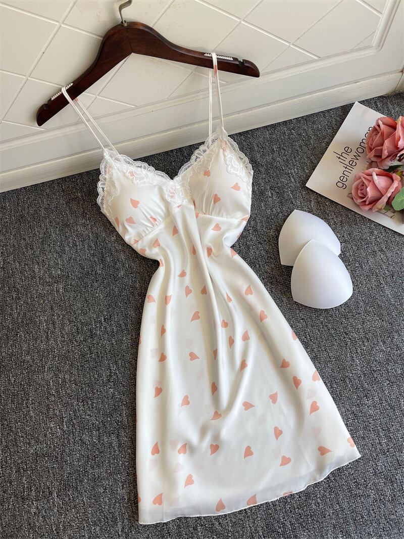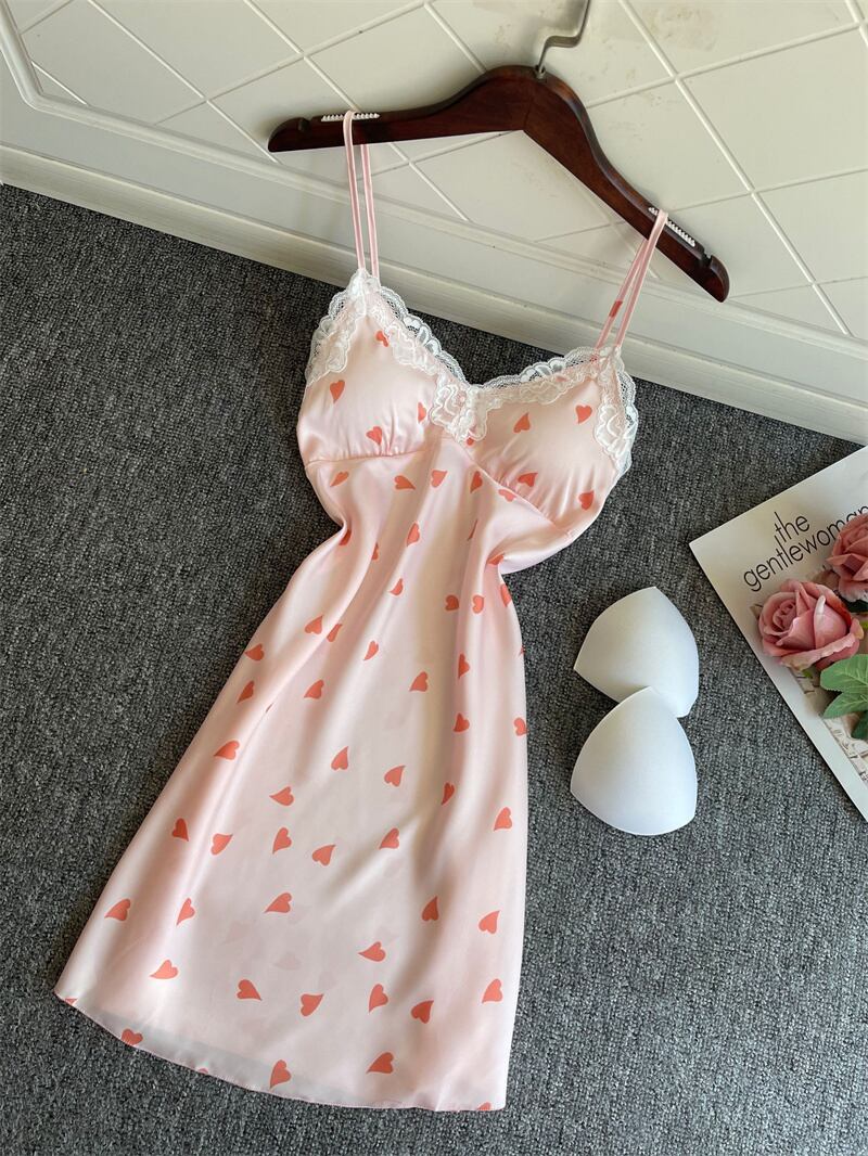 胸パッド付きins甘い小さな愛のプリントスリング女性の春のシンプルなセクシーなアイスシルクパジャマショートスカートの韓国語バージョン 大人ガーリー スウィート キュート カジュアル スプリング 春物 韓国ファッション スタイル NEW ランジェリー セクシー ルームウェア84420314944 | Plug Shop