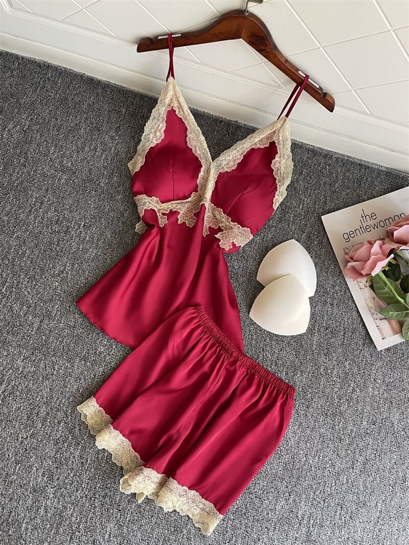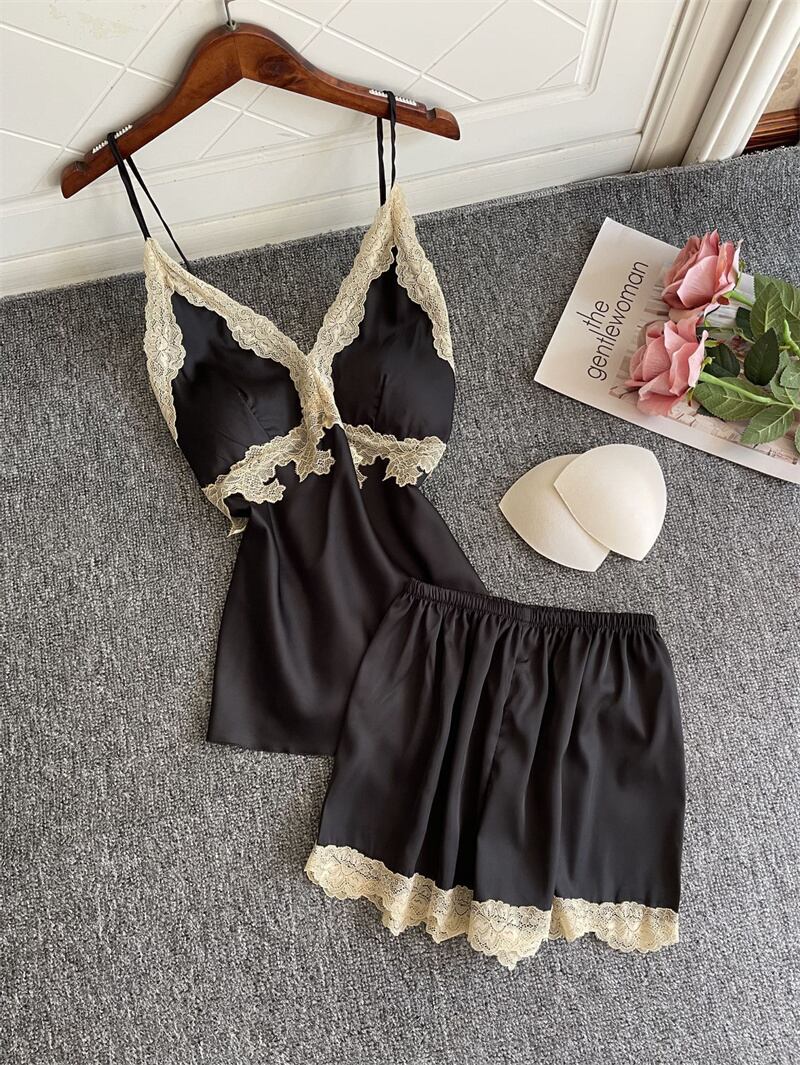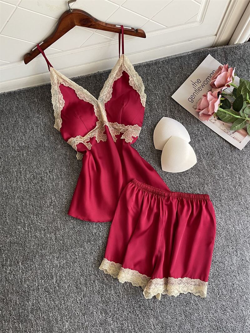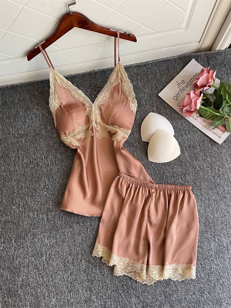 パジャマ女性の夏のセクシーなレースカジュアル薄いVネックサスペンダーシルクショーツチェストパッドホームセットで新しいスタイル 夏物 ランジェリー セクシー ルームウェア97086787533 | Plug Shop